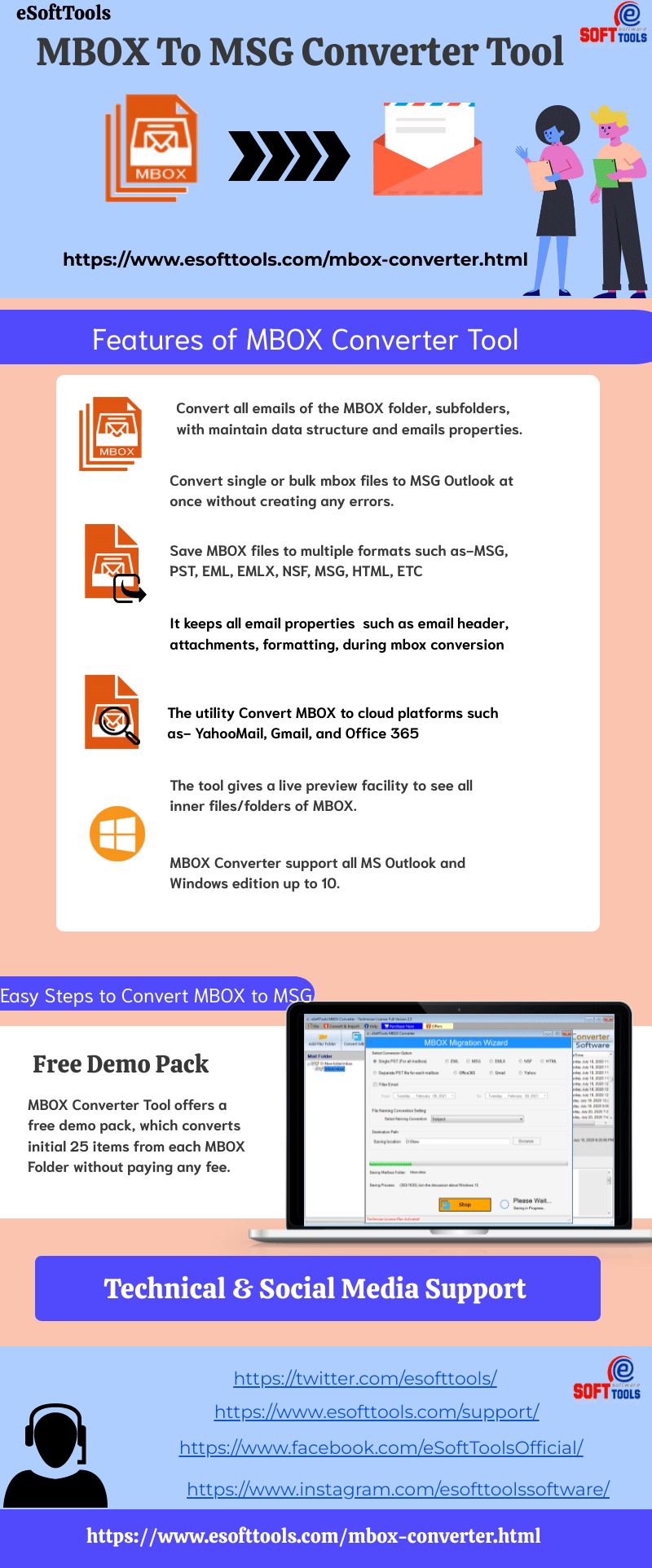 Today I suggest that you use eSoftTools MBOX Converter Software quick process to convert MBOX to MSG Outlook Message files. This software imports single and bulk MBOX files to MSG. It can be very easy and very simple to understand this software. This software MBOX files to import another format MSG, EML, EMLX, YahooMAIL, Office 365, Gmail, EML, NSF, HTML, etc. This software is MBOX file support and could email clients including Thunderbird, SeaMonkey, Opera Mail Endoura Mail, Apple Mail Entourage, etc. This software provides a free Demo version and first-time MBOX files to convert 25 items from the folder and Bulk folder.