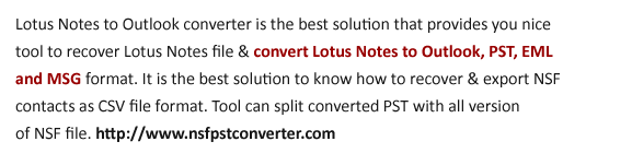 To migrate your Lotus Notes file to Outlook with the help of NSF to PST Converter tool. It tool easily migrate all NSF files like email messages, appointments, contacts, notes, tasks, attachments, images etc. The software provides offers two saving options as RTF & Text file format. Get more information, visit from: http://www.recoveryfix.com/lotusnotestooutlook.html